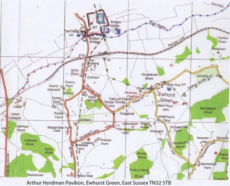 The ARTHUR HERDMAN PAVILION and the adjacent HERDMAN FIELD are situated in the village of EWHURST GREEN on the road between BODIAM (distance 1 mile approximately) and NORTHIAM (just under 2 miles); CRIPPS CORNER is about 2½ miles and STAPLECROSS about 1½ miles. It is essential to have your own transport as the nearest mainline station, ROBERTSBRIDGE, is approximately 4 miles away, with HASTINGS 9 miles to the South and the town of BATTLE 7 miles to the South West.